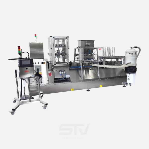 Le monobloc STV assure les fonctions de REMPLISSAGE de produits denses et semi-denses, COMPLÉTAGE SOUS VIDE avec des liquides de couverture et FERMETURE de pots, bouteilles et contenants.