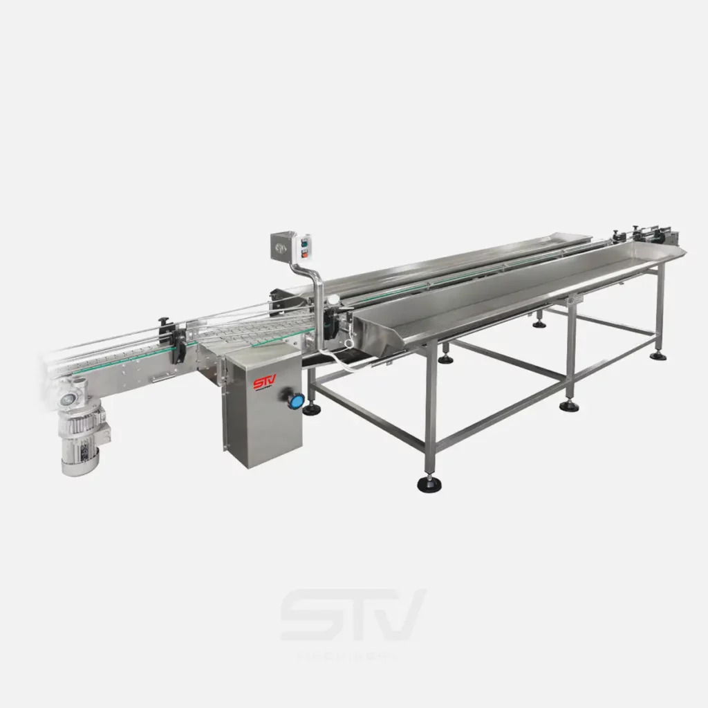 Successivamente i contenitori raggiungono la zona di scolmatura dove, mediante guide inclinate vibranti, viene espulso il prodotto in eccesso viene espulso.