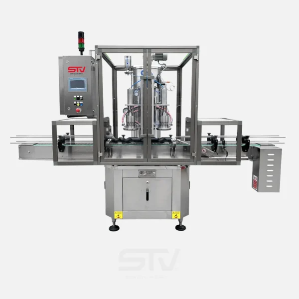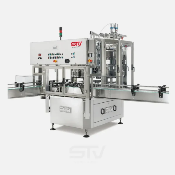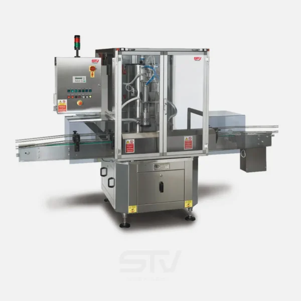 Après le jutage les récipients sont convoyés à la Capsuleuse. Prédisposition de la machine à être alimentée par une pompe ou par chute. La machine est réglable en hauteur par un vérin électrique avec dispositif électromécanique. Rapidité du système de changement de format pour des récipients de diamètre et hauteur différents. Après la mise en marche et les réglages nécessaires la machine ne nécessite pas de l’assistance de l’opérateur.