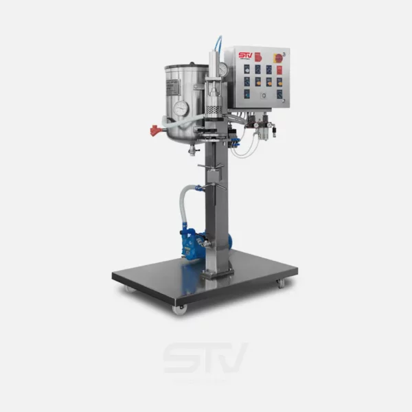 Après le remplissage avec le produit solide (au moyen de la Table de Remplissage motorisée ou de la Remplisseuse à Vibration) les récipients sont alimentés à la Juteuse par un convoyeur. Une vis sans fin en polyzène les synchronise et une étoile d’entrée les positionne sous les vannes de jutage. À ce point-ci les vannes, au moyen de cylindres pneumatiques, descendent et se posent sur les récipients en faisant commencer les opérations de jutage ainsi résumées: